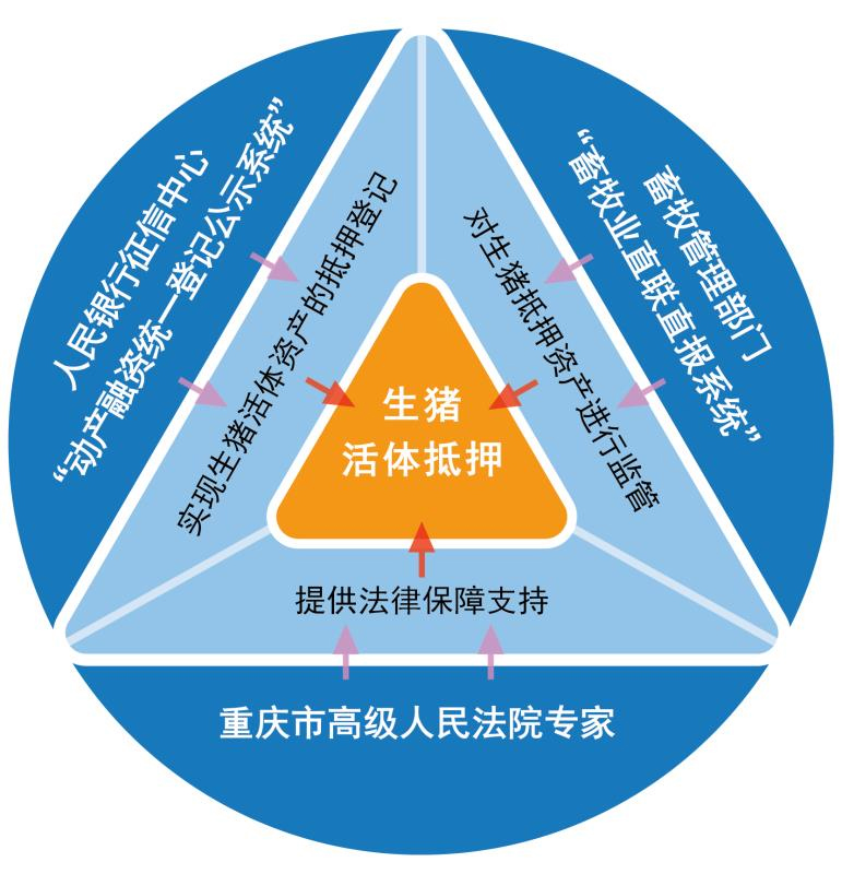 在黔江、涪陵、荣昌三地试点,探索数据赋能,解决生猪活体抵押贷款不能贷难题。利用人民银行征信中心的“动产融资统一登记公示系统”大数据,实现生猪活体资产的抵押登记,并出具有效证明文件。利用畜牧管理部门“畜牧业直联直报系统”大数据,对生猪抵押资产存出栏数、防疫检验、市场价格等情况进行监管,并定期、不定期向贷款银行反馈,帮助承贷银行控制抵押生猪资产风险。重庆市高级人民法院专家对生猪活体抵押的效力进行解读,为数据赋能提供法律保障。