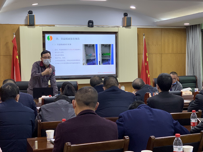 此次培训会由区畜牧中心生产区站陈勇站长和重庆69国家生猪核心育种场场长、国家生猪产业技术体系重庆试验站站长蒲强主讲,会上就猪常温精液安全生产、母猪发情鉴定、生猪人工授精技术、常温精液保存规范等生猪人工授精技术要点进行了讲授。