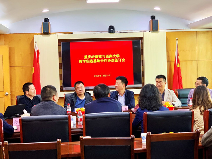 为拓展西南大学动科院动物科学和动物医学专业学生实践空间,加强新农科建设,促进产学研融合发展,2019年10月19日,西南大学动科院与重庆六九畜牧科技股份有限公司共建教学科研实习基地签约仪式在重庆市黔江区畜牧技术推广中心举行,重庆市黔江区副区长孙天明、区农工委书记农委主任杨泽迁、区畜牧技术服务中心主任张青华及副主任向飞宇、重庆六九畜牧科技股份有限公司董事长罗云、重庆畜牧科学院研究员王金勇,西南大学动物科学院院长赵永聚、院长助理赵中权等共同参加了签约仪式。赵永聚院长与罗云董事长共同签订了合作协议书,并给公司授予 “西南大学动物科技学院教学科研实习基地”匾牌。