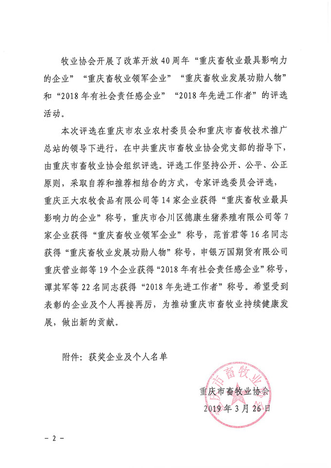 69畜牧继续被授予黔江区优秀农业企业
