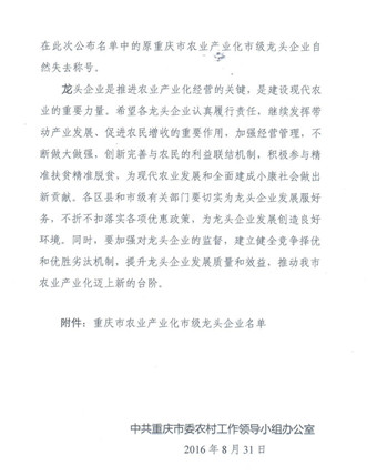 根据《重庆市农业产业化市级龙头企业申报认定与监测管理办法(试行) 》(渝委农工组办〔2011〕7号)规定,市农委组织开展了2016年农业产业化市级龙头企业申报及监测工作。在区县和市级有关部门审核上报、有资质中介机构评审基础上,经研究并向社会公示,决定认定重庆六九畜牧科技股份有限公司为重庆市农业产业化市级龙头企业。