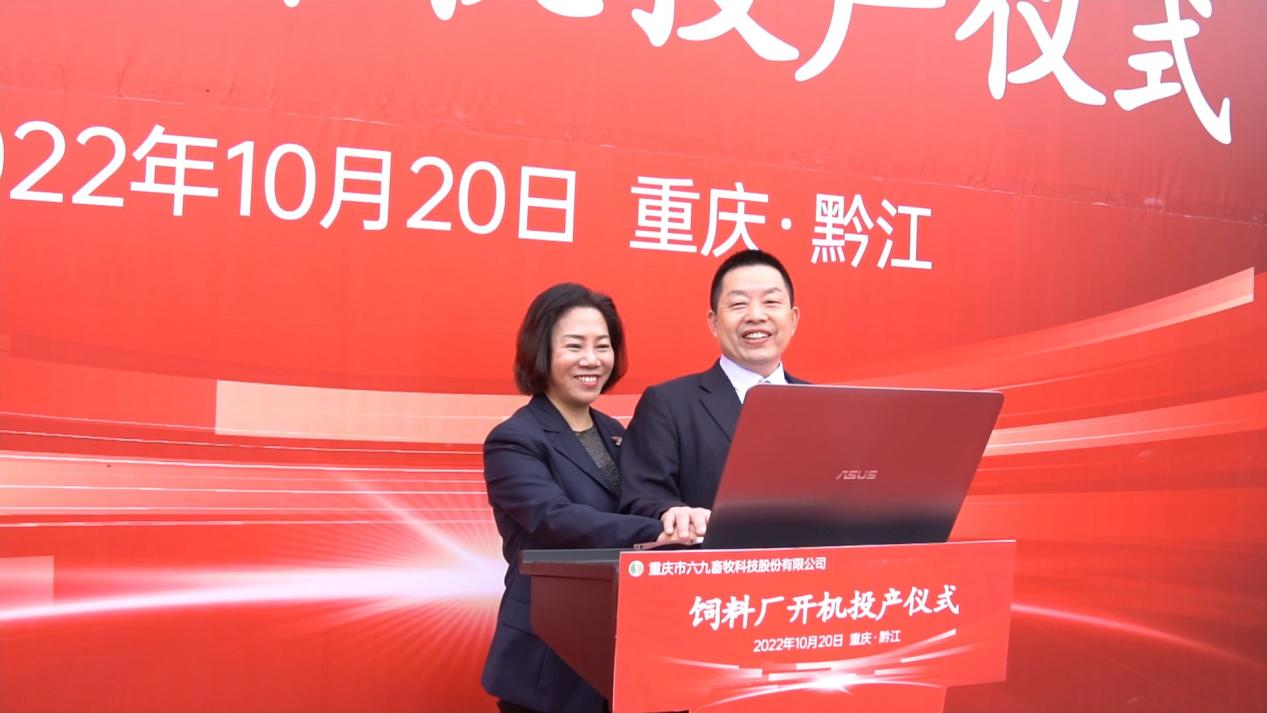 随后,69畜牧总经理罗云宣布正式投产开机,携手董事长王藜线上一键开机启动生产设备开始投产。