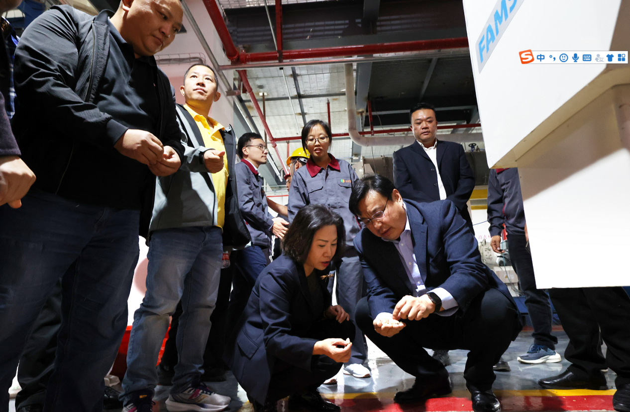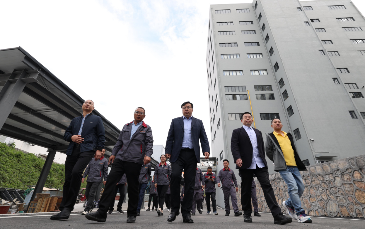 开机投产仪式后,参加仪式的领导一行实地参观厂区生产线运作情况,并见证69畜牧饲料厂首车饲料出厂。
