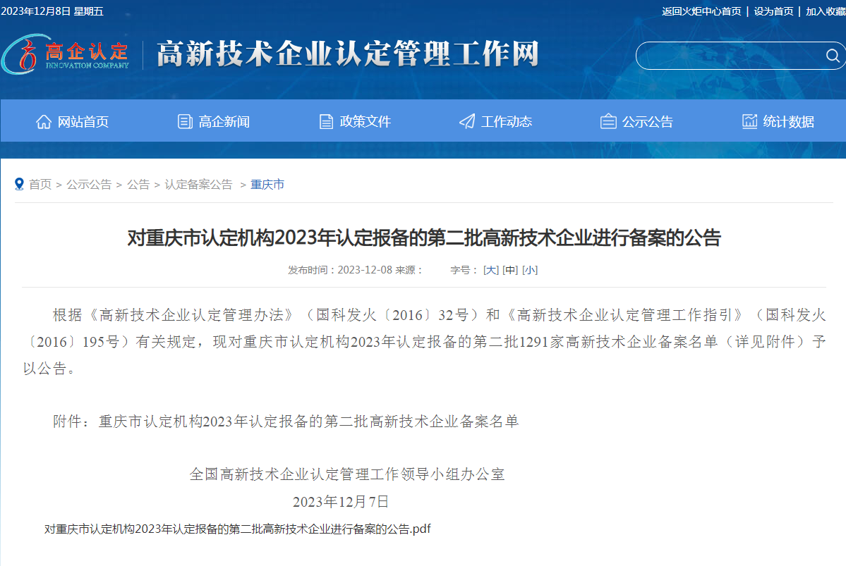 2023年12月7日,全国高新技术企业认定管理工作领导小组办公室公告:重庆市六九畜牧科技股份有限公司通过2023年第二批高新技术企业复审。