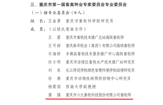 重庆市第一届畜禽种业专家委员会正式成立,重庆市六九畜牧科技股份有限公司副总经理蒲强同志入选重庆市第一届畜禽种业专家委员会猪专业委员会成员。蒲强也是唯一一位工作在民营企业的猪专业委员会成员。