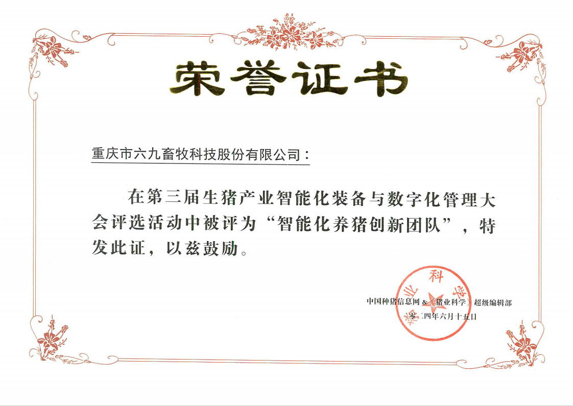 6月15日,由中国种猪信息网&《猪业科学》超级编辑部、中国畜牧兽医学会信息技术分会主办的第三届生猪产业智能化装备与数字化管理大会在河南南阳召开。69畜牧应邀参会并参与中国生猪产业智能化与数字化管理的学习和交流。会上,69畜牧获评“智能化养猪创新团队奖”,公司发展部副部长肖俊获评“智能化养猪青年才俊”荣誉称号。