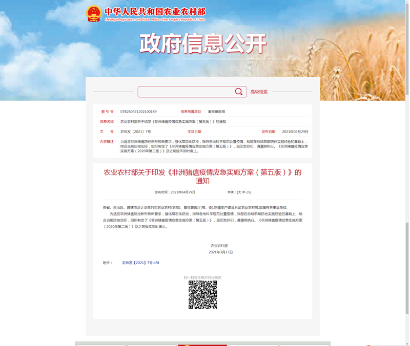 为适应非洲猪瘟防控新形势新要求,强化常态化防控,指导各地科学规范处置疫情,我部在总结前期防控实践经验的基础上,结合当前防控实际,组织制定了《非洲猪瘟疫情应急实施方案(第五版)》,现印发你们,请遵照执行。《非洲猪瘟疫情应急实施方案(2020年第二版)》及之前版本同时废止。