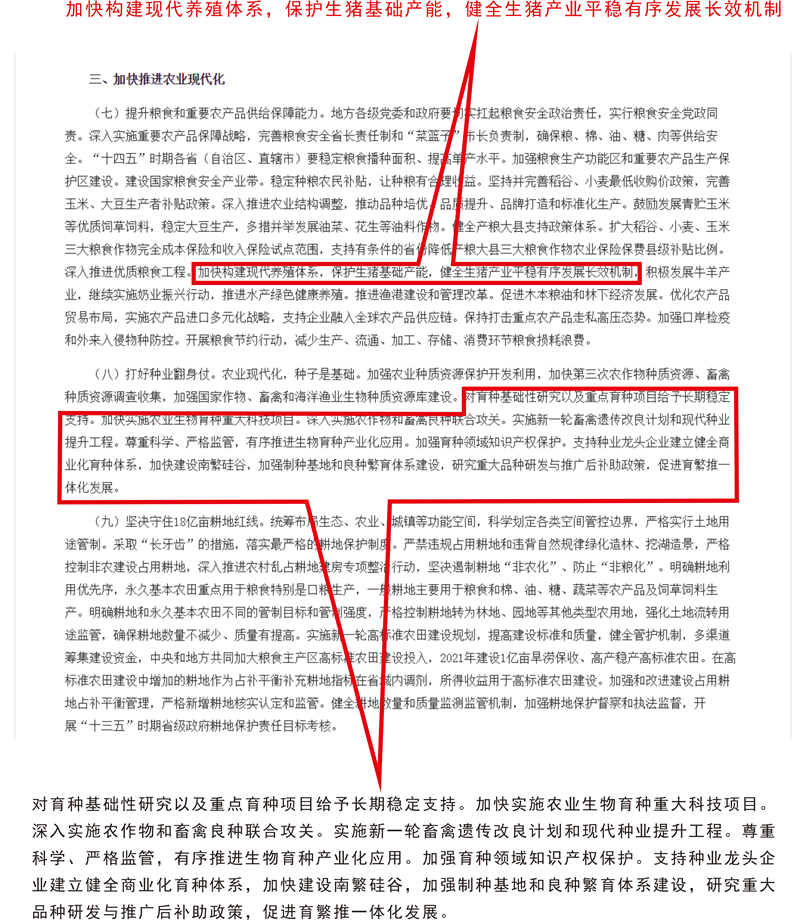 《中共中央 国务院关于全面推进乡村振兴加快农业农村现代化的意见》提出:加快构建现代养殖体系,保护生猪基础产能,健全生猪产业平稳有序发展长效机制,积极发展牛羊产业,继续实施奶业振兴行动,推进水产绿色健康养殖。